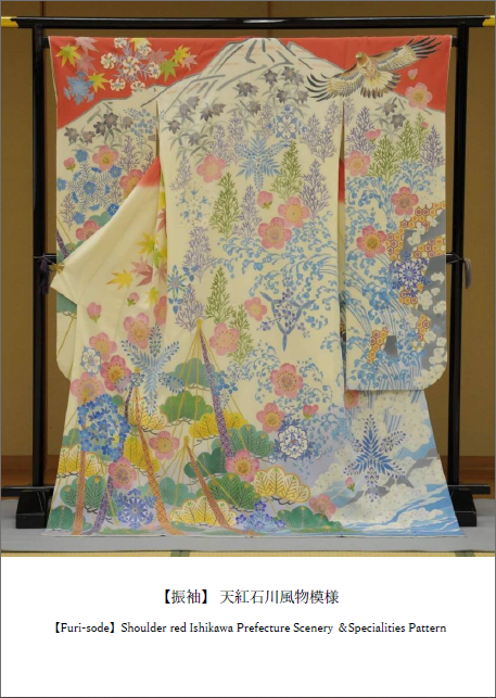 「天紅石川風物模様(てんべにいしかわふうぶつもよう)」は、肩口に紅色を差した振袖に、石川県を象徴する自然のモチーフを描きました。県鳥イヌワシ、県木あて(能登ヒバ)、そして県花のクロユリ。石川の豊かな風土と、そこに息づく生命の気配をぬくもりのある色彩を使って、郷土への想いを込めました。