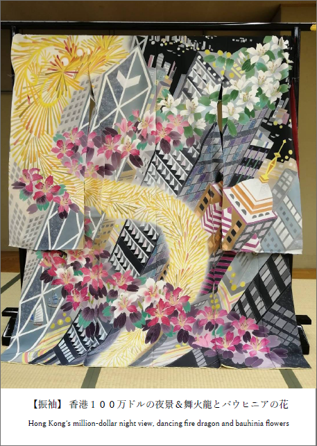 「イマジン ワンワールドKIMONOプロジェクト」で世界を着物で表現する企画の依頼を受けて製作したものです。企画展用の出品作品ですので、着るにはかなり派手ですが、香港の夜景と舞火龍とバウヒニアの花を大胆にデザインし、エネルギッシュな香港の夜を表現してみました。