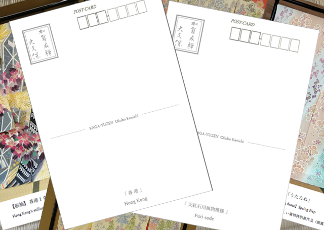 加賀友禅作家 大久保謙一の着物作品、一枚一枚に込めた想いや、四季折々の情景、美しい色彩を、気軽に多くの方の目に触れていただきたい——そんな願いから、絵葉書にしてみました。作風がよく見てとれることと思います。手のひらに収まる小さな紙面には、着物の中に描いた物語や日本の美が凝縮されています。飾って楽しむのはもちろんのこと、大切な方へのお便りにご利用いただくことで、加賀友禅の美しさも広く伝わることを願っております。